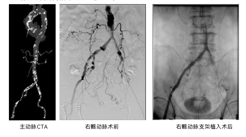 先由心内科团队完成右冠脉慢性完全闭塞(CTO)病变介入治疗,植入支架,改善冠脉供血,为后续治疗提供保障;再用经导管方式置换主动脉瓣(TAVR),由心外科与血管外科通过局部切开后穿刺股动脉,球囊扩张狭窄的髂动脉后建立了TAVR入路,心内科团队完成植入26mm球囊扩张式瓣膜;最后由血管外科团队完成髂动脉支架植入,同台解决其髂动脉狭窄问题。