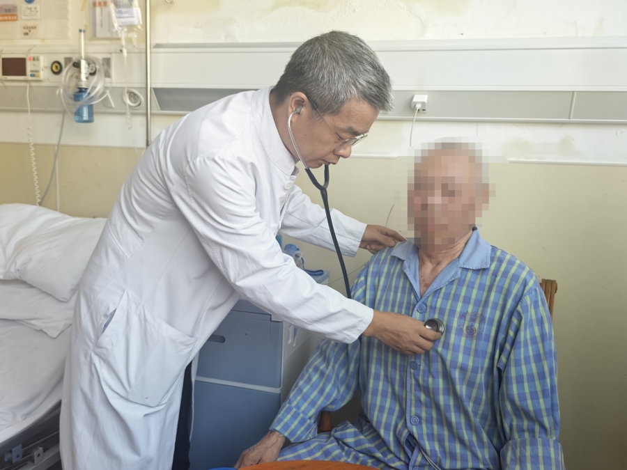 东方医院北院心血管内科主任张奇在病房为王老伯听诊。 李宝花 摄